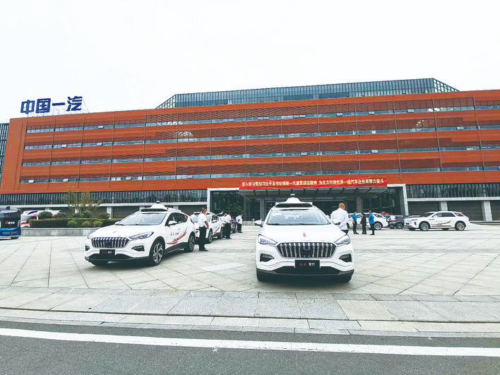 8月29日,“旗智春城”智能网联示范区项目启动,中国一汽测试车辆整装待发。