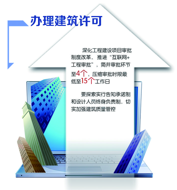 深化工程建设项目审批制度改革,推进“互联网+工程审批”,简并审批环节至4个,压缩审批时限最低至15个工作日;要探索实行告知承诺制和设计人员终身负责制,切实加强建筑质量管控。