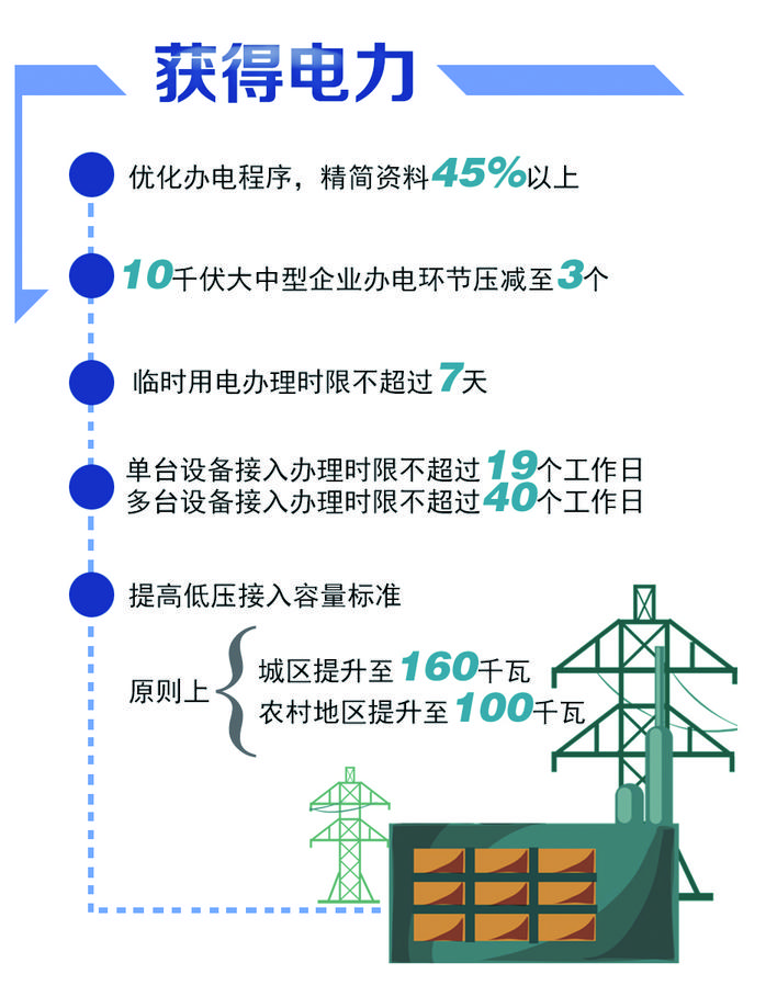 进一步优化办电程序,精简资料45%以上,10千伏大中型企业办电环节压减至3个,临时用电办理时限不超过7天,单台设备接入办理时限不超过19个工作日,多台设备接入办理时限不超过40个工作日。优化办电服务,推行免证受理、线上办理、掌上办理;推行低压小微企业用电报装“三零”服务(零审批、零投资、零上门);提高低压接入容量标准,原则上城区提升至160千瓦、农村地区提升至100千瓦;加强供电可靠性管理,研究建立中断供电惩罚机制,大力推行“不停电”作业,压减停电时户数。建立配套服务机制,适当降低重点发展企业涉电成本。