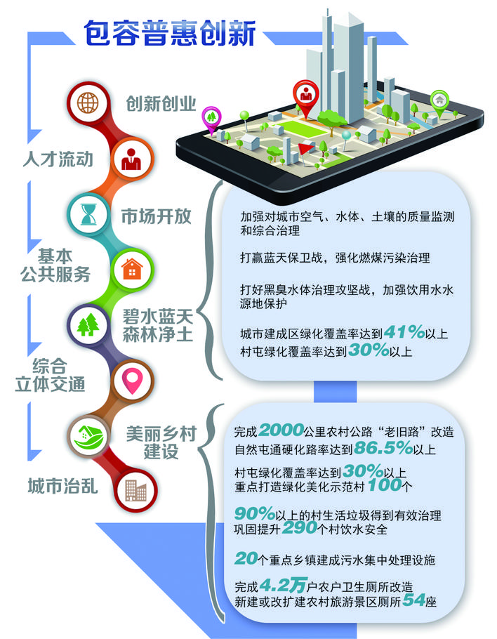 ——美丽乡村建设。深入开展农村人居环境综合整治,全面加强村庄规划、村庄建设、生态环境、经济发展、公共服务、乡风文明等方面建设,完成2000公里农村公路“老旧路”改造,自然屯通硬化路率达到86.5%以上;村屯绿化覆盖率达到30%以上,重点打造绿化美化示范村100个;90%以上的村生活垃圾得到有效治理;巩固提升290个村饮水安全;20个重点乡镇建成污水集中处理设施;完成4.2万户农户卫生厕所改造,新建或改扩建农村旅游景区厕所54座。