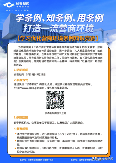 “2021年全省营商环境建设工作目标是什么?”“‘简政放权’的具体要求有哪些?”“长春新区‘万人助万企’行动,发挥了哪‘四大员’作用?”……5月18日,随着长春新区“学条例、知条例、用条例,打造一流营商环境”知识竞赛的开启,一场全区机关干部职工、企事业单位职工、广大居民群众全面参与的学习宣传营商环境知识活动,掀起新区优化营商宣传月系列主题活动新高潮。
